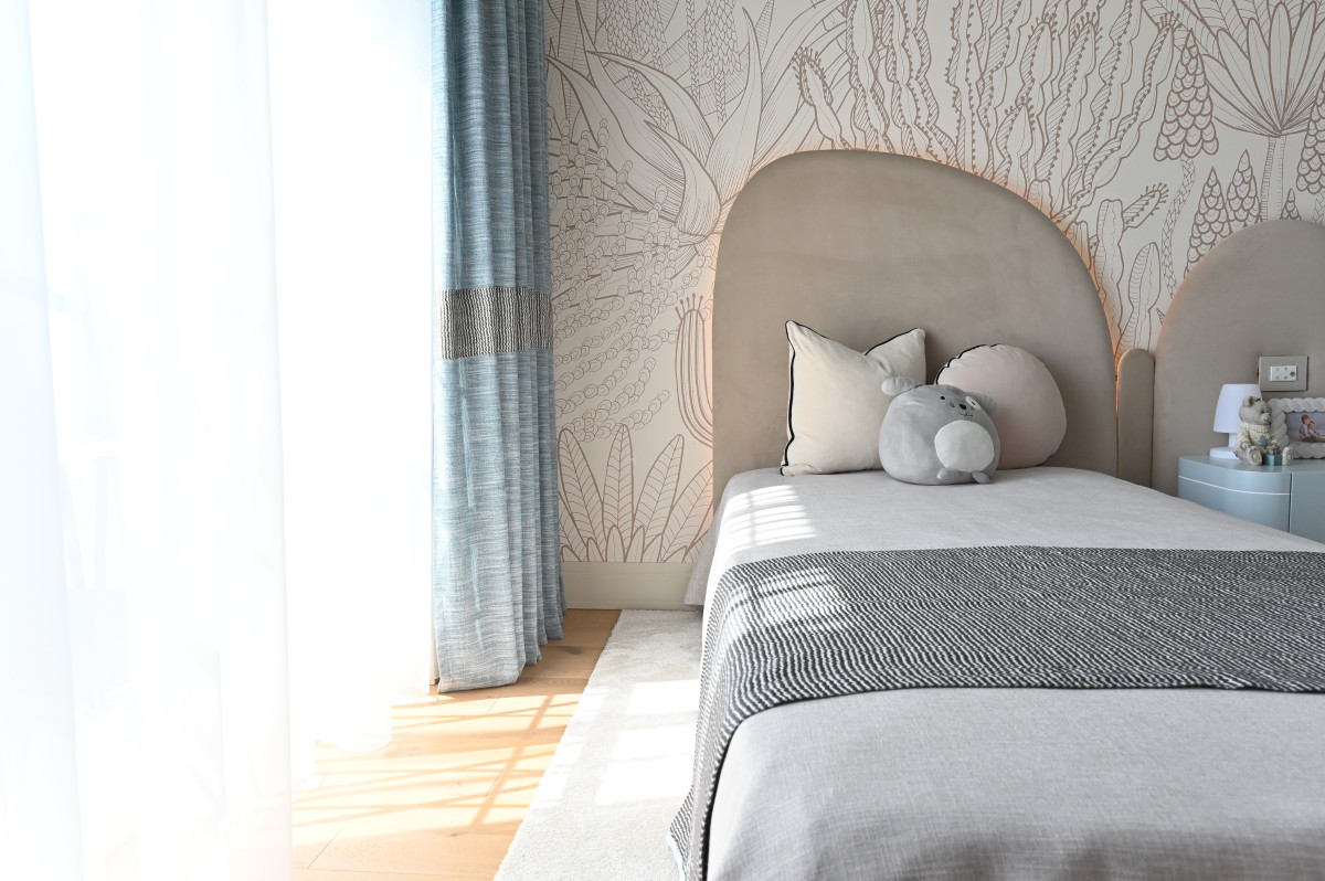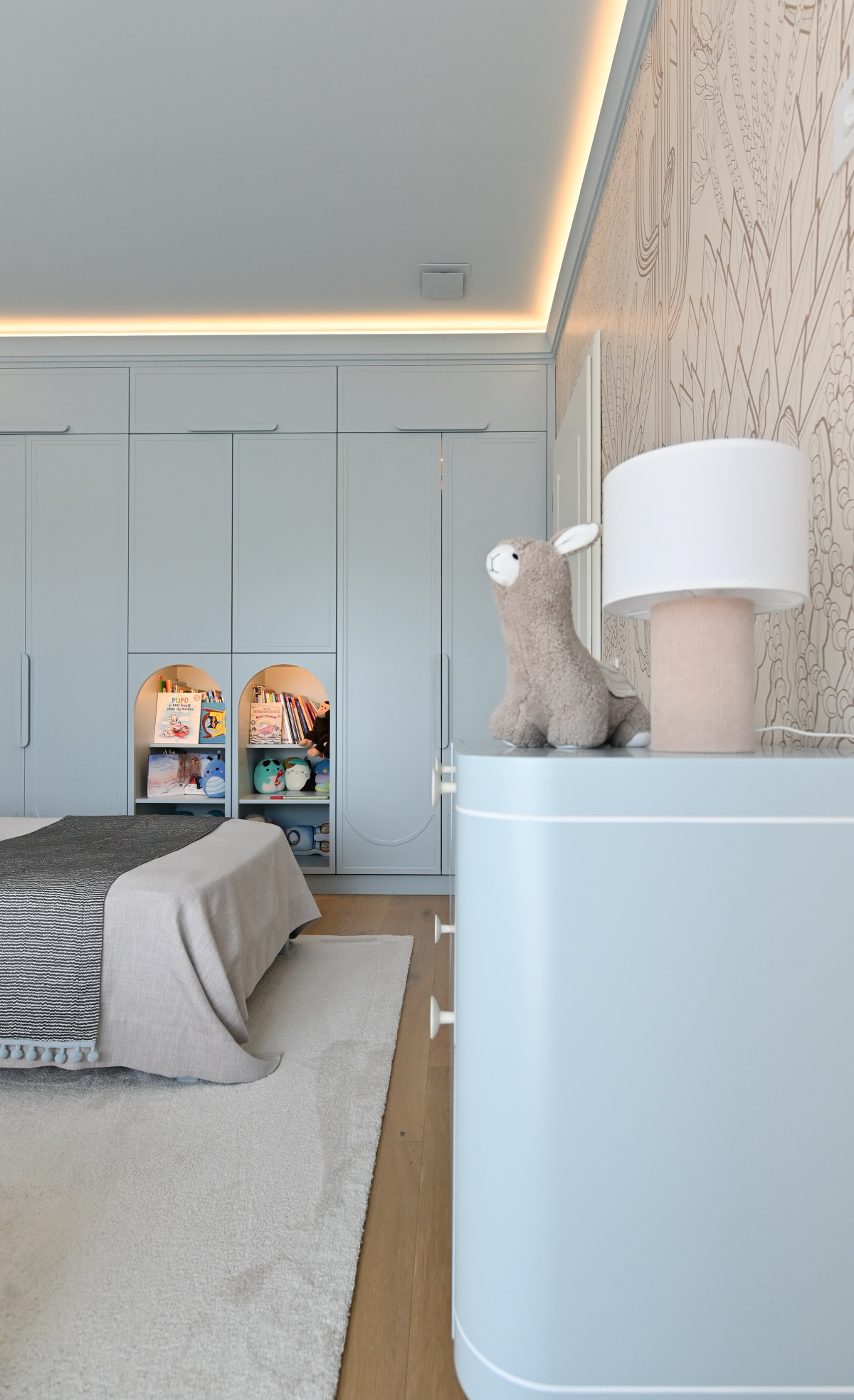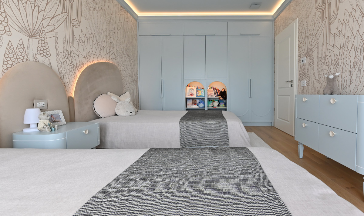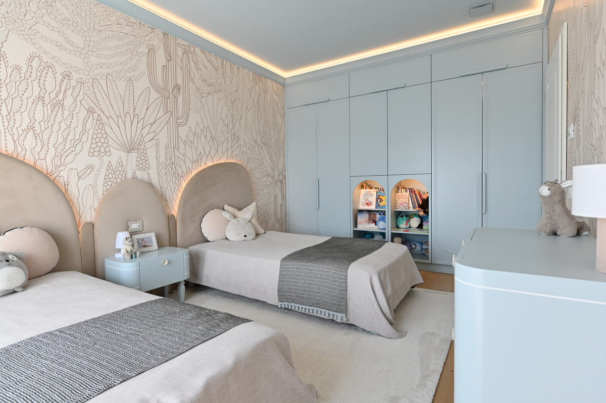 De asemenea, pentru a adăuga căldură și adâncime fără a perturba paleta cromatică, s-a optat pentru finisaje de perete cu texturi subtile. Tapetul ales nu încarcă spațiul, ci îl „îmbracă”, reflectând lumina naturală într-un mod difuz și plăcut. Această simbioză între liniile curate ale profilelor și suprafețele texturate transformă "The White House" într-o lecție de rafinament minimalist.