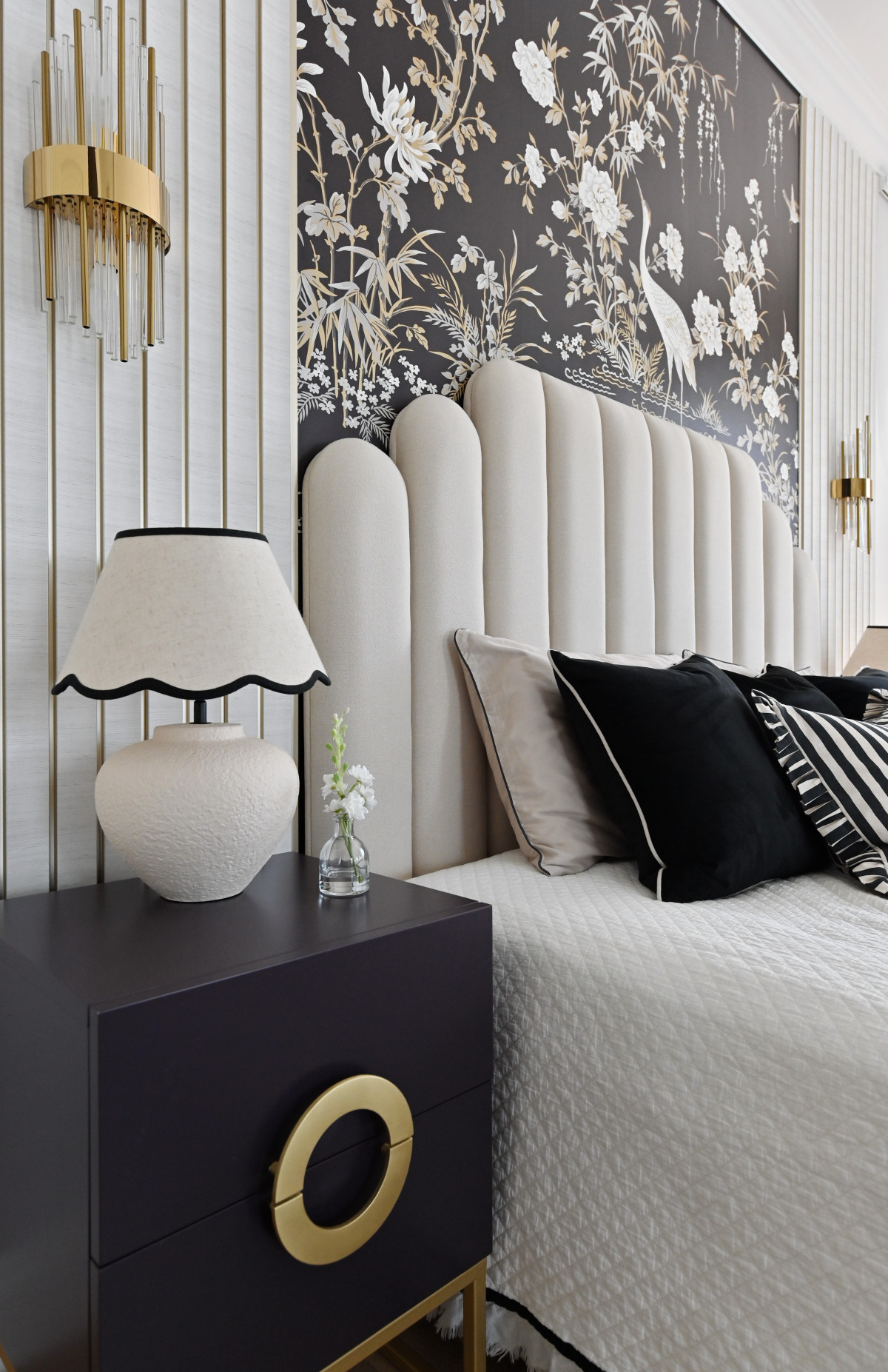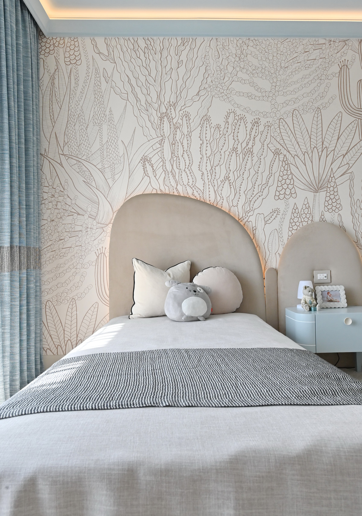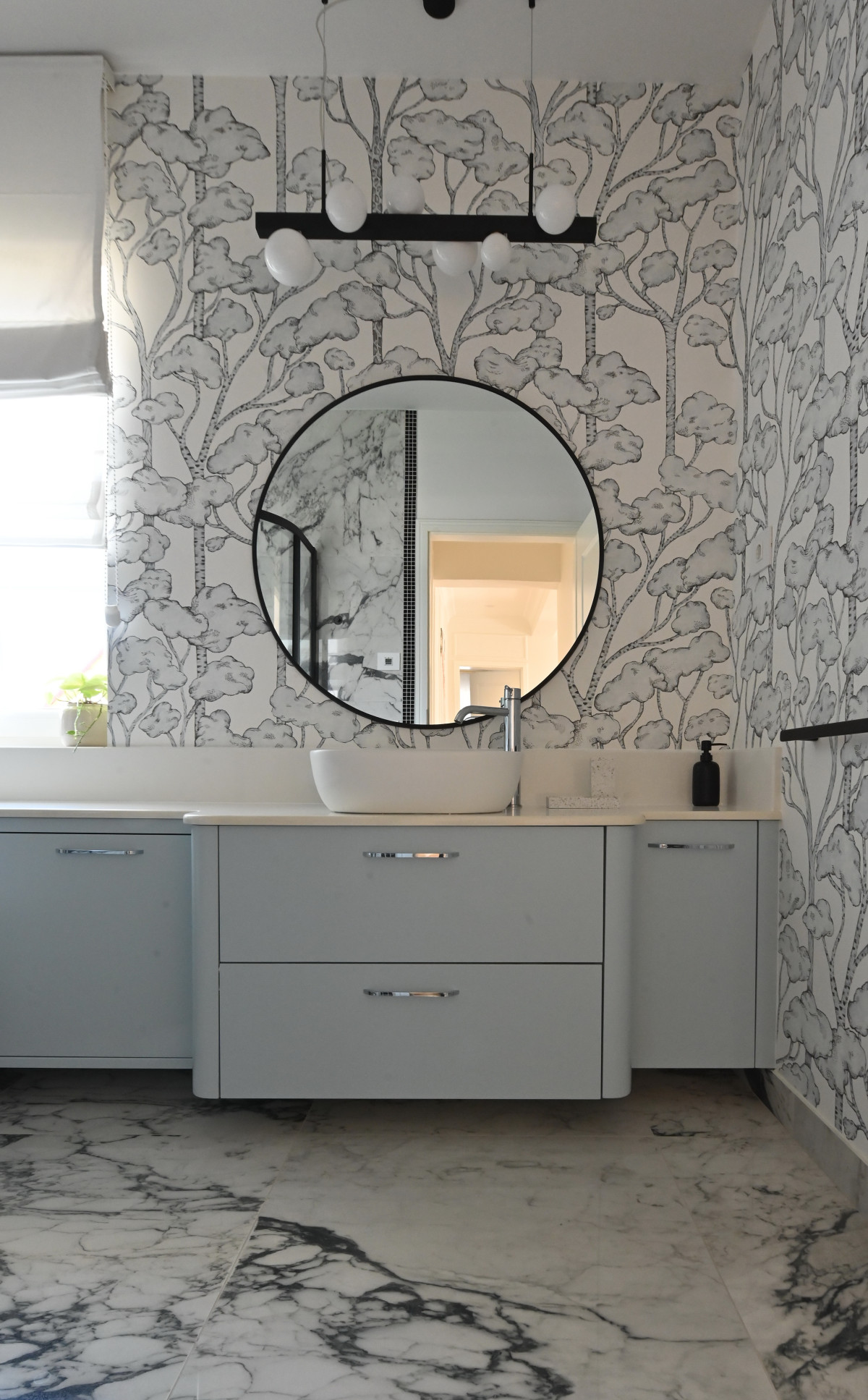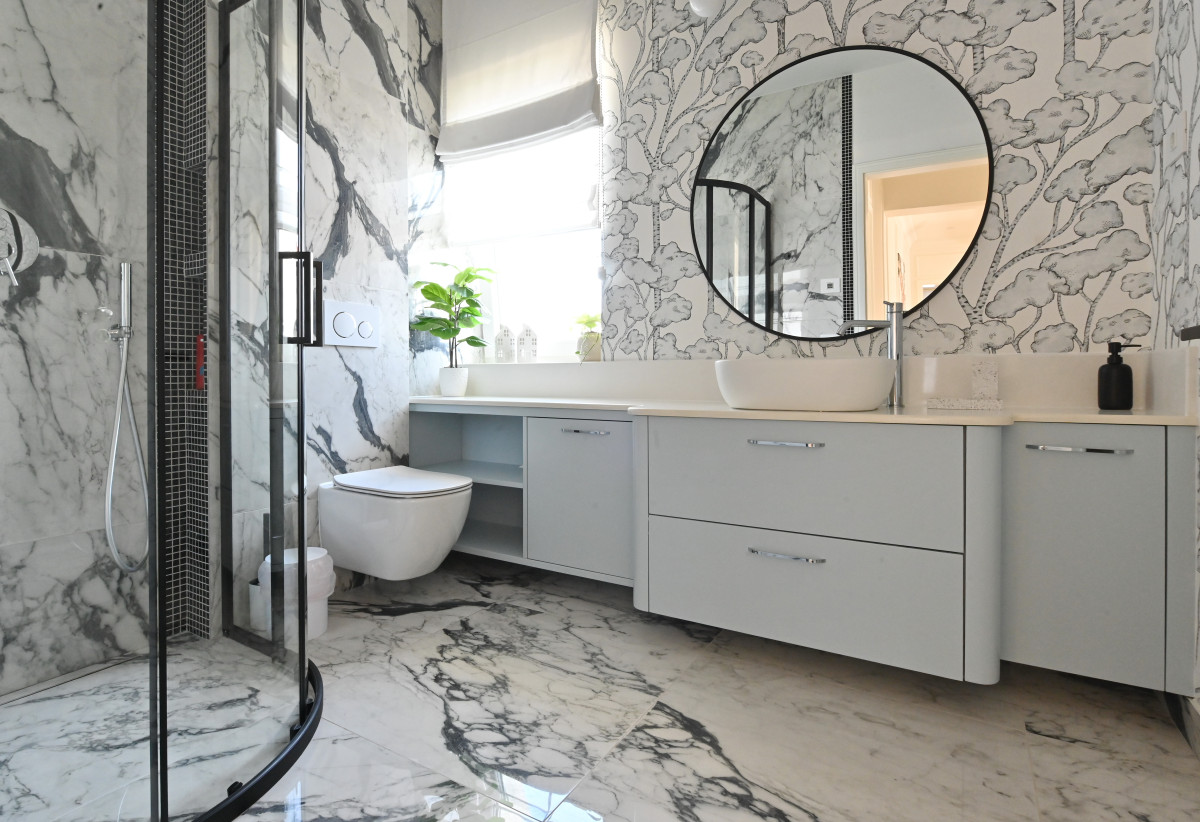De asemenea, pentru a adăuga căldură și adâncime fără a perturba paleta cromatică, s-a optat pentru finisaje de perete cu texturi subtile. Tapetul ales nu încarcă spațiul, ci îl „îmbracă”, reflectând lumina naturală într-un mod difuz și plăcut. Această simbioză între liniile curate ale profilelor și suprafețele texturate transformă "The White House" într-o lecție de rafinament minimalist.